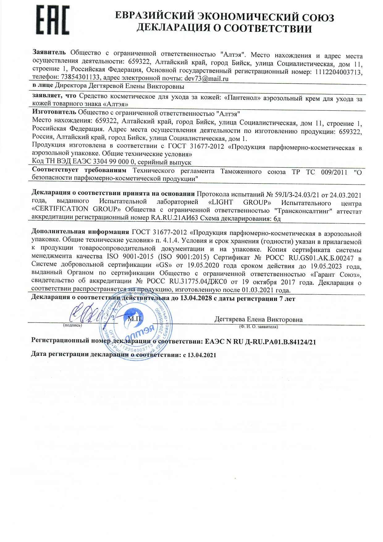 Д-пантенол (дексапантенол), входящий в состав аэрозольного крема успокаивает кожу при солнечных и термических ожогах, улучшает регенерацию тканей при наружном применении, увлажняет и снимает покраснение кожи.