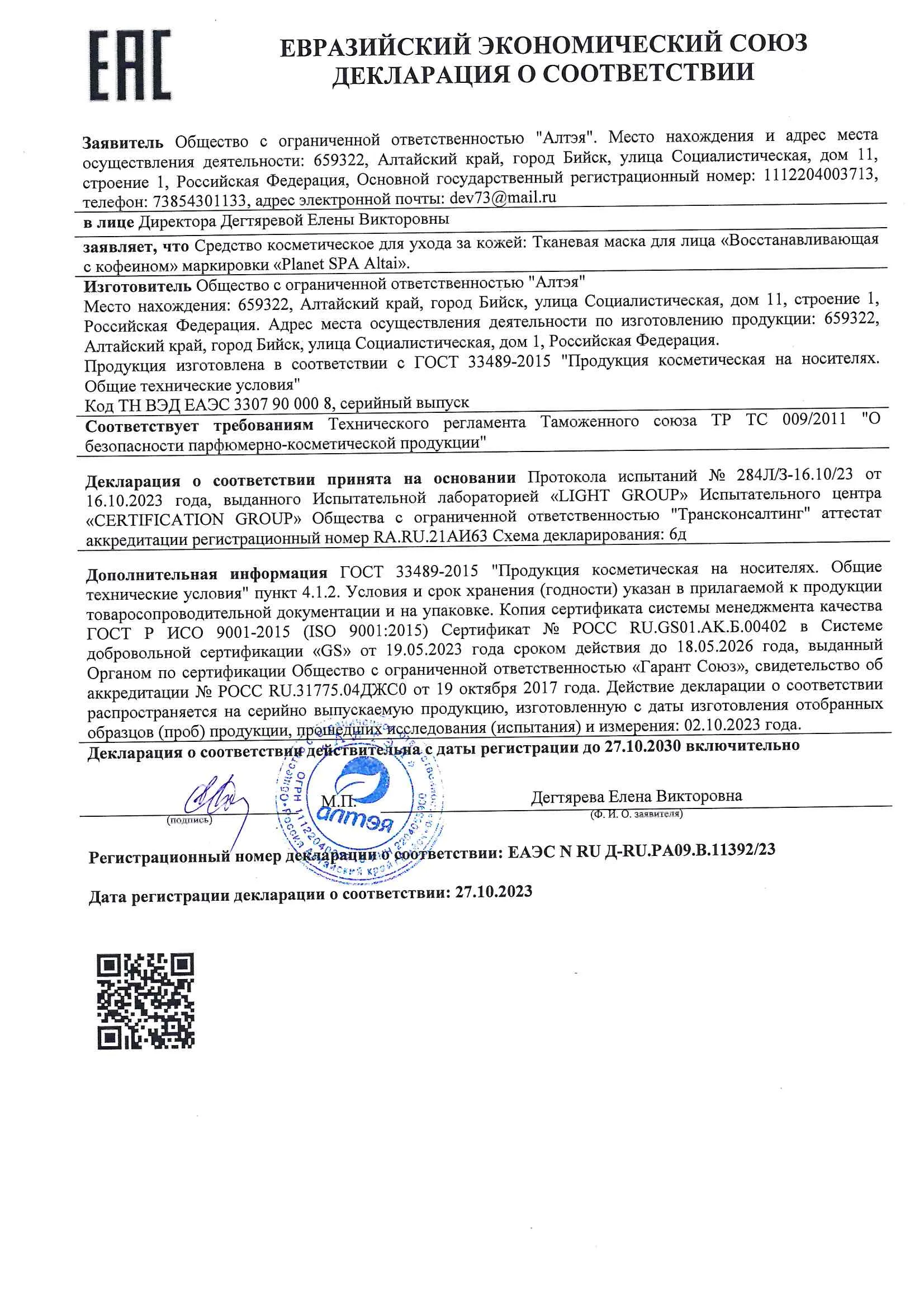 Тканевая маска для лица Planet SPA Altai «Восстанавливающая с кофеином»
