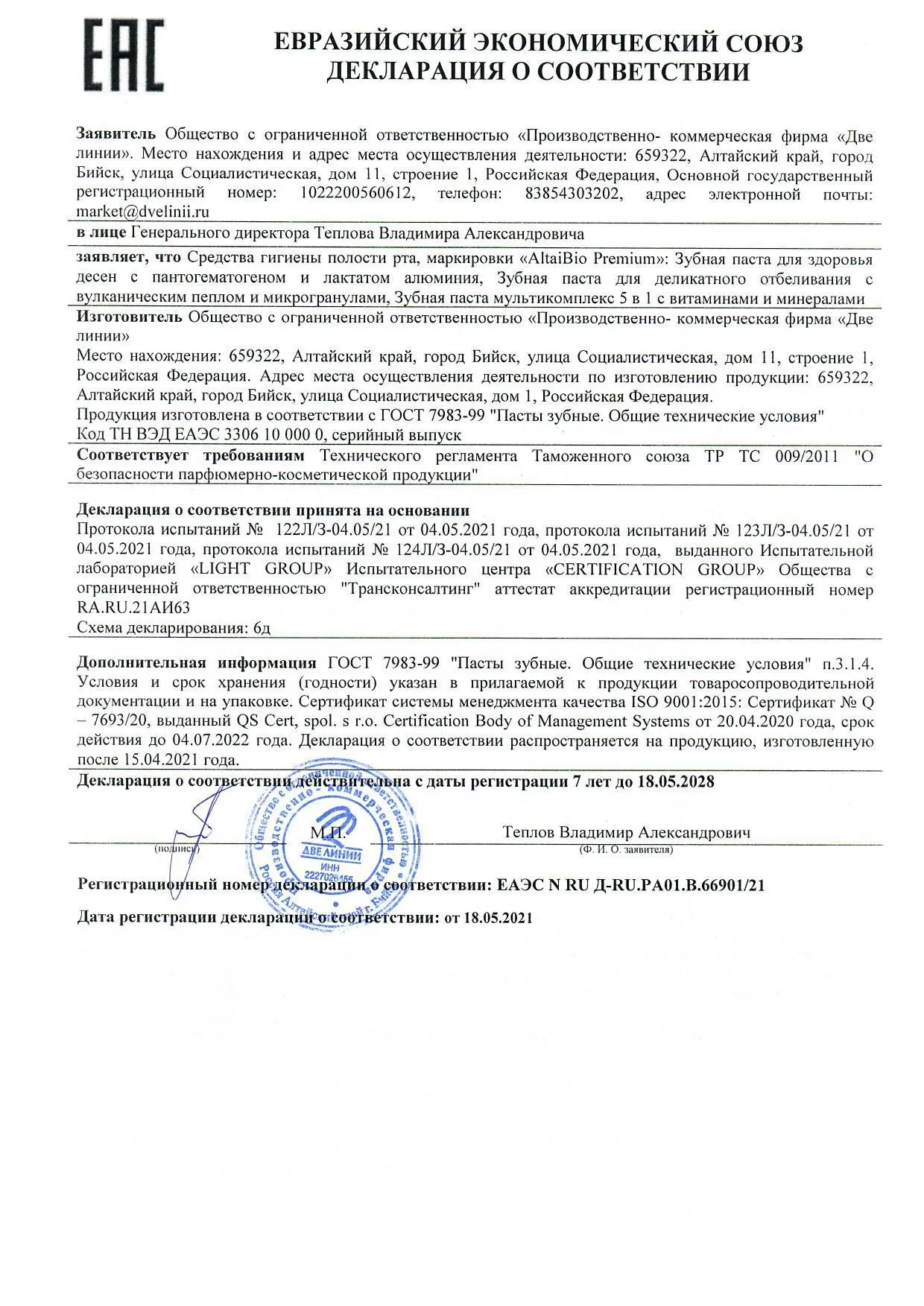 ALTAI BIO PREMIUM Зубная паста для здоровья десен с пантогематогеном и лактатом алюминия