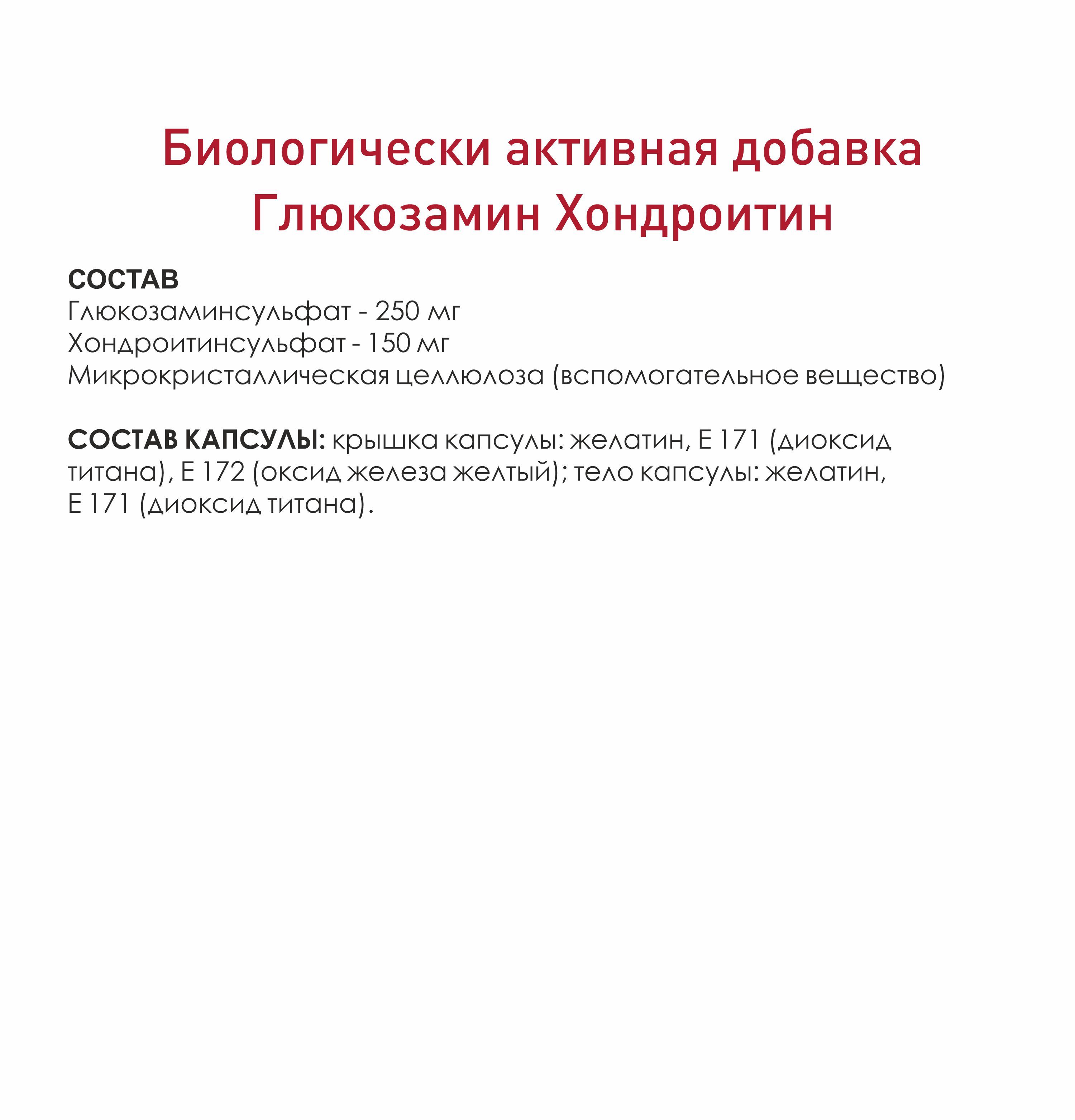 В рекомендованной суточной норме (4 капсулы) содержится глюкозамина 700мг*. Хондроитина 600мг.