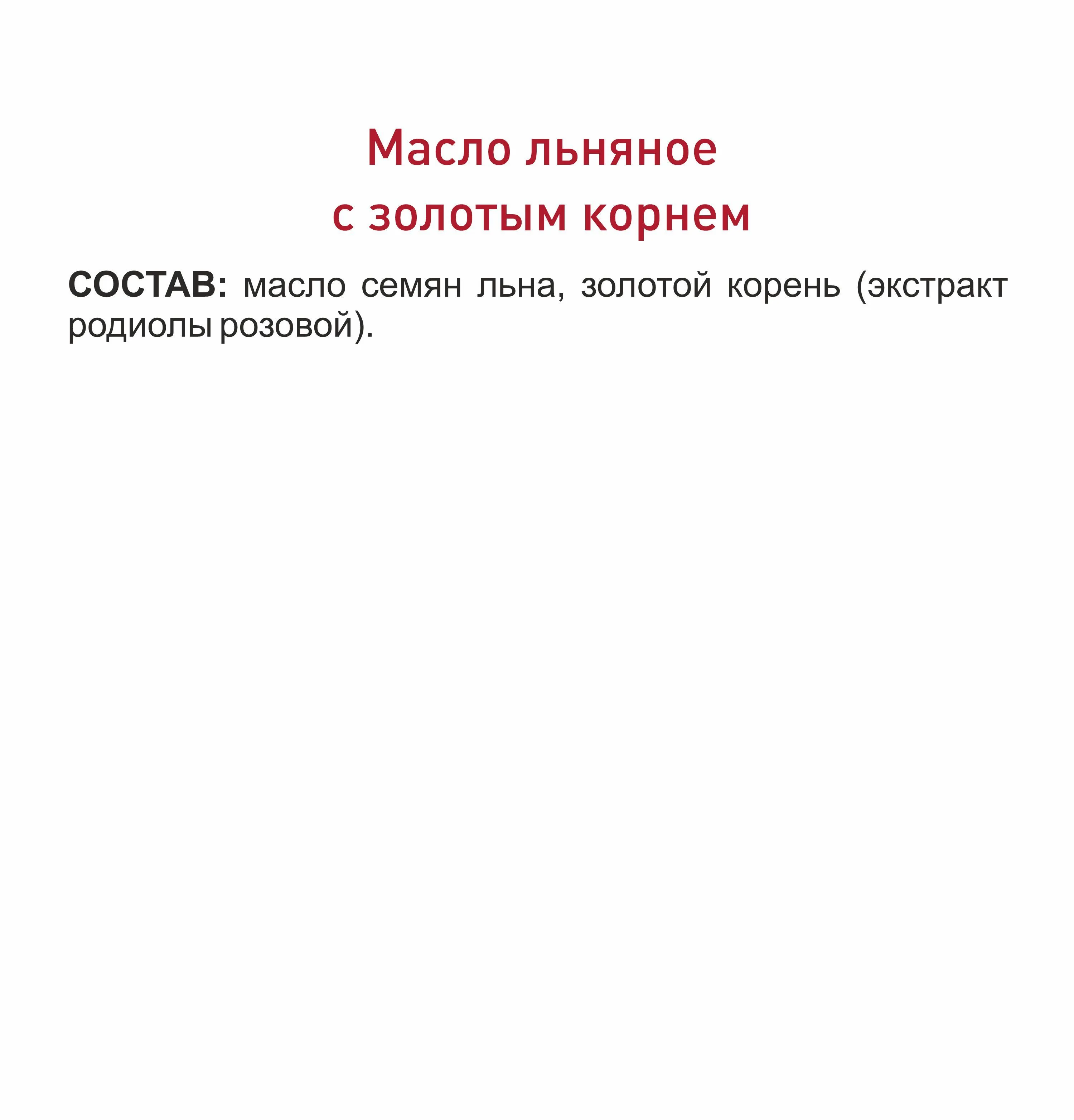 Льняное масло с золотым корнем – это прекрасное средство при повышенной раздражительности, нервном и физическом истощении. Благодаря выраженному адаптогенному действию, наше масло помогает при усиленной умственной работе, укрепляет иммунную систему организма, помогает справиться с тревожностью, сонливостью, апатией. После перенесенных заболеваний масло рекомендуется применять для ускорения процесса восстановления сил и поддержания ослабленных систем организма.