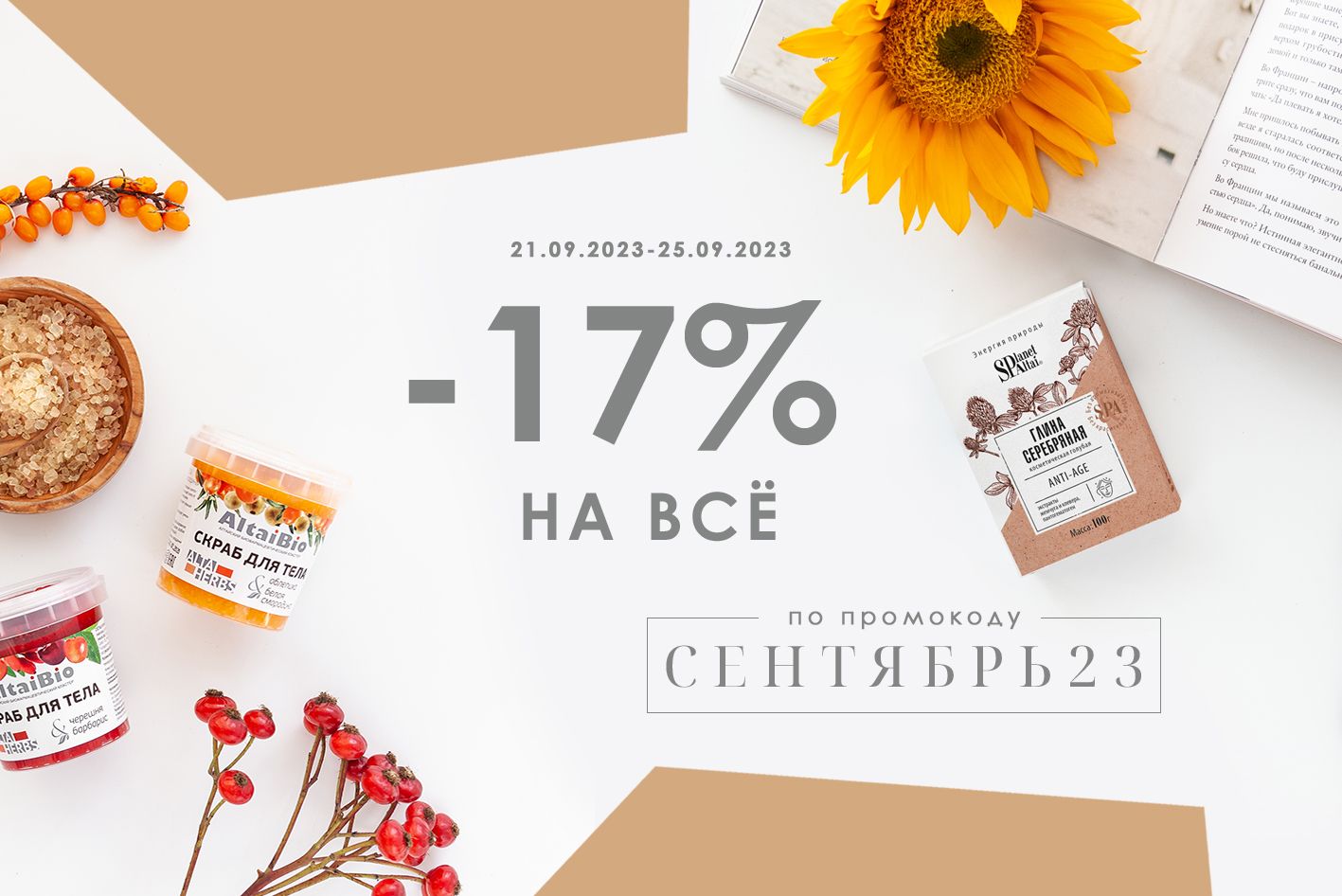 С 21 по 25 сентября действует скидка 17% на весь ассортимент по промокоду СЕНТЯБРЬ23.