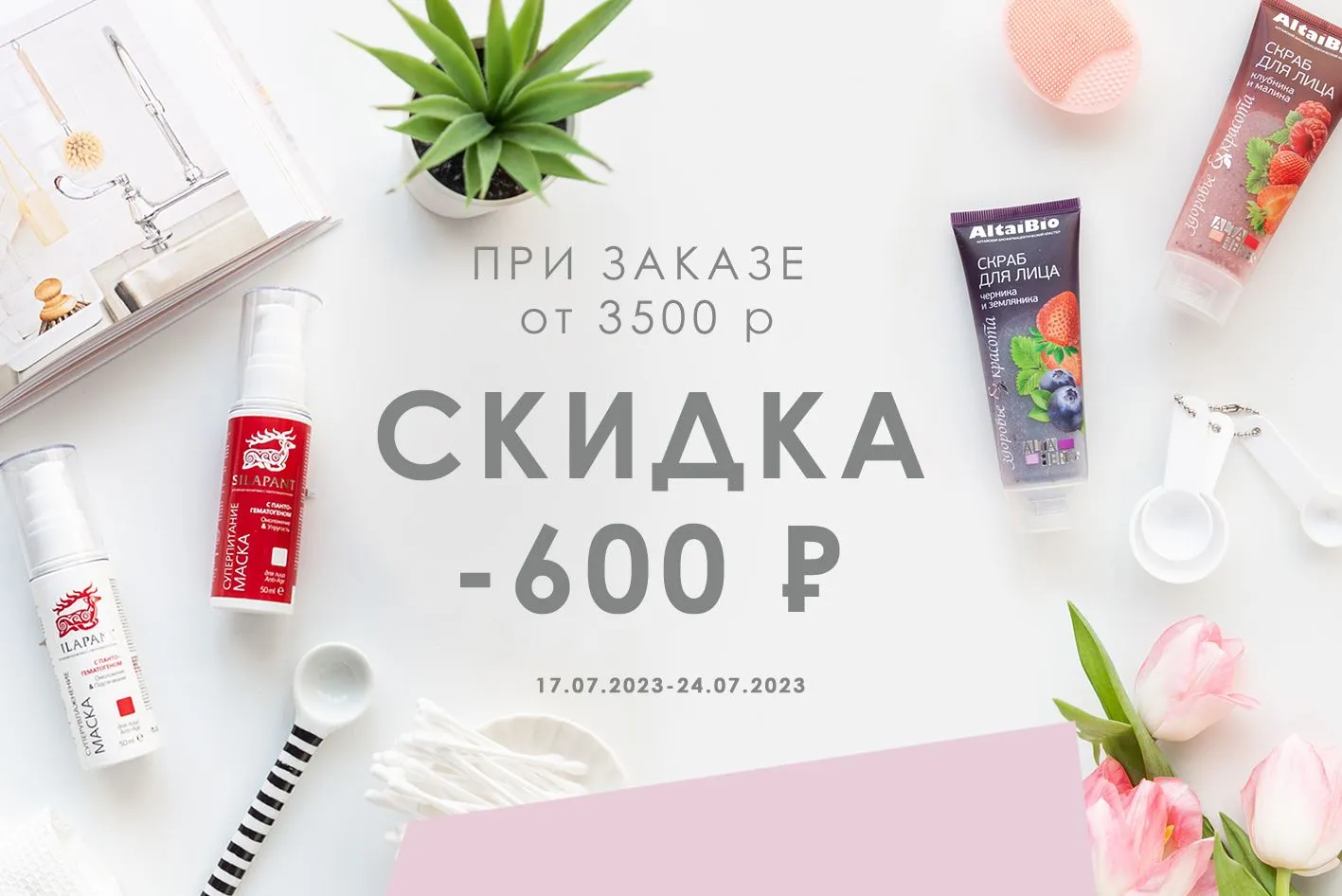 С 17 по 24 июля 2023 совершите покупку на сумму от 3500 рублей и получите скидку 600 рублей.