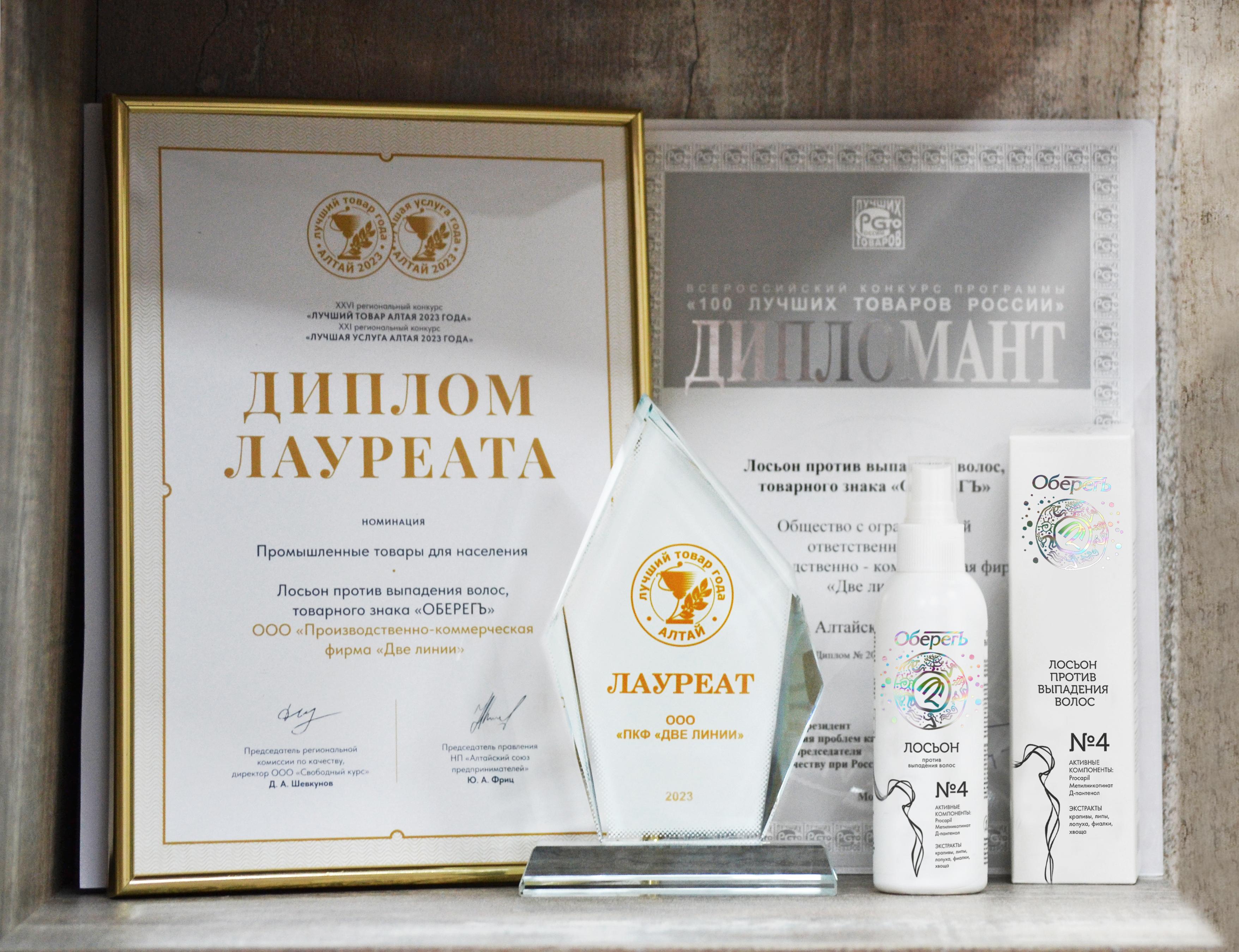 Лосьон против выпадения волос "Оберегъ" стал лауреатом сразу в двух конкурсах: Лучший товар Алтая и 100 лучших товаров России.